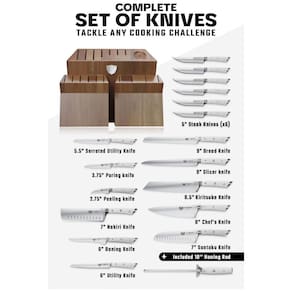 Excelente artesanato, tecnologia de ponta, elementos de design impressionantes e materiais premium. O desempenho máximo nunca pareceu tão bom a esse preço. Incrivelmente afiado, full tang, aço alemão importado de alto carbono com uma borda polida à mão em 16 18 graus por lado. Precisamente temperado e resistente a manchas. Este conjunto vai durar uma vida. Design famoso, com peso satisfatório, materiais premium e sensação de qualidade. As alças de polímero ABS de luxo são rebitadas triplamente com uma aderência que garante conforto e manobrabilidade. Laminado e polido para uma construção sanitária, perfeito para cozinhas ocupadas. Certificado pela National Sanitation Foundation NSF aplica se apenas a facas. Projetado com perfeição com dureza Rockwell 56 e polido à mão para um acabamento acetinado. Cuidadosamente afilado para maior dureza, flexibilidade e resistência mínima ao corte. Conjunto completo em um impressionante bloco de madeira de acácia feito à mão. Certificado pela National Sanitation Foundation NSF aplica se a facas Marca: Não Informado