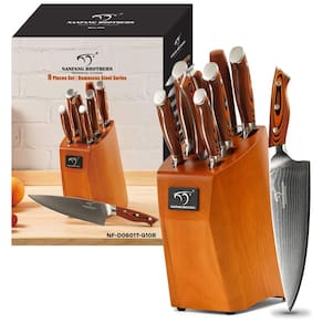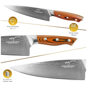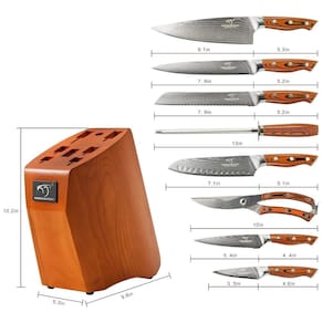 CONJUNTO COMPLETO TUDO EM UM Conjunto de facas profissional Damasco inclui faca de chef de , faca de corte de , faca de pão de , faca de Santoku de , faca de serviço de , faca de aparar de , tesoura de cozinha, afiador de facas para ficar Bloco de madeira afiada e natural. PROJETO DE QUALIDADE As facas são fabricadas com núcleo de aço VG10 67 camadas de lâminas de aço damasco superiores para precisão e exatidão. Dureza HRC 602 para nitidez excepcional, retenção de borda. Alça de design curvo proporciona conforto e suporte. DURÁVEL E FÁCIL DE LIMPAR O design integrado da lâmina e da haste não é fácil de quebrar, e durável. Garante um desempenho duradouro e fácil de limpar. Você pode economizar muito tempo na limpeza. FÁCIL DE CUIDAR E ZENAMENTO A parte do bloco de madeira é feita de carvalho natural durável, e o assento da faca oca é mais fácil de inserir e remover, e higiênico. Use mais garantido Marca: Não Informado