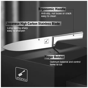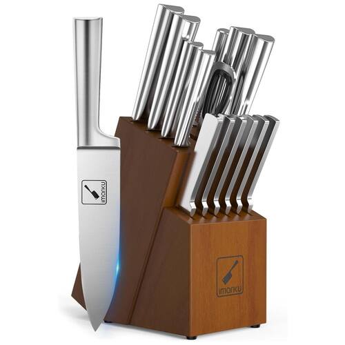CONJUNTO DE FACAS DE COZINHA EXCLUSIVO conjunto de facas imarku 15 peças com bloco inclui faca chef, faca santoku, faca de pão, faca de fatiar, faca, faca de cozinha, tesoura de cozinha, conjunto de 6 facas para bife, haste de afiar faca e bloco de faca de madeira. Apenas o conjunto de facas de chef certo para satisfazer todas as suas necessidades culinárias CONJUNTO DE FACAS DE EXCELENTE QUALIDADE COM BLOCO Cada lâmina de faca neste conjunto de facas é feita de aço inoxidável alemão de alto carbono premium com excelente resistência à ferrugem, corrosão e descoloração. Qualidade testada por 100 chefs antes de vender este conjunto de facas de cozinha, nenhuma das facas enferrujou ou quebrou dentro de seis meses de uso adequado. CONJUNTO DE FACAS ULTRA SHARP O processamento acetinado profissional fornece nitidez ideal e afia ainda mais a borda da lâmina para obter fatias ultrafinas e corte preciso. É um conjunto de facas de chef profissional e pode atender às necessidades diárias da cozinha, como fatiar, cortar, picar, etc. CUIDADO FÁCIL A ventilação inferior do bloco de facas foi projetada para evitar que o porta lâminas fique úmido e mantenha as lâminas secas. Pode ser lavado na máquina de lavar louça, mas a lavagem à mão pode manter melhor a nitidez e o brilho da faca Marca: Não Informado
