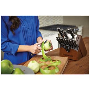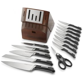 Afiadores de cerâmica embutidos afiam facas automaticamente a cada uso. Aço alemão totalmente forjado, de alto carbono e sem manchas. Facas para bife feitas de aço asiático estampado Alças rotuladas para fácil identificação no bloco. Full tang design para força e equilíbrio Marca: Não Informado