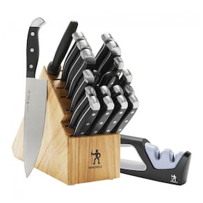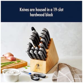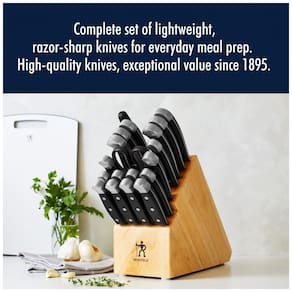 O conjunto de facas de cozinha HENCKELS Statement de 20 peças oferece lâminas em aço inoxidável com afiação fina e serrilhada para cortes precisos em preparos domésticos completos, incluindo carnes, vegetais, pães e desossa. O bloco organizador armazena as facas com proteção adequada e inclui aço de afiação 23 cm e afiador bônus para manutenção do fio. Construção full tang com cabos plásticos tradicionais proporciona equilíbrio e manobrabilidade em uso diário.