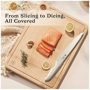 O conjunto de facas de cozinha imarku de 14 peças em aço inoxidável de alto carbono oferece lâminas forjadas com afiador embutido no bloco de madeira sólida para manutenção prática do fio, adequado para cortes em carnes, vegetais, frutas e pães em preparos domésticos diários. O design com cabos em polipropileno antiderrapante promove controle seguro mesmo com mãos úmidas ou gordurosas. Bloco organizador em acabamento cinza-branco otimiza espaço na bancada.