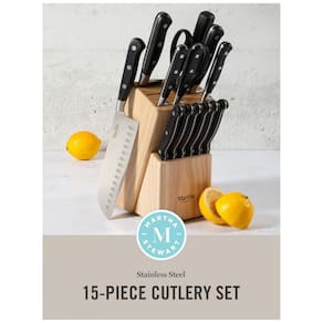 O conjunto de facas de cozinha Martha Stewart Carverton de 15 peças em aço inoxidável de alto carbono oferece lâminas forjadas full tang com distribuição uniforme de peso para equilíbrio em cortes variados de carnes, vegetais, pães e frutas, adequado para preparos domésticos diários. Inclui bloco em madeira de borracha para organização e aço de afiação para manutenção do fio. Cabos em ABS com três rebites promovem aderência firme em formato tradicional reto.