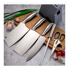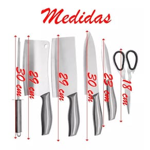 Conjunto de 7 peças: 4 facas de tipos e tamanhos variados, suporte / base Giratorio, Chaira e Tesoura.