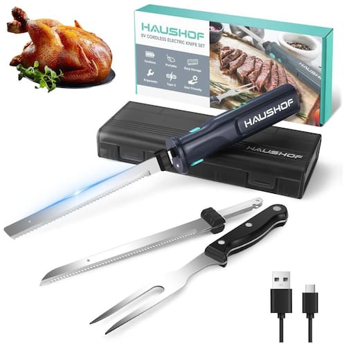 O Conjunto de Facas Elétricas da HAUSHOF é a solução perfeita para quem busca praticidade e precisão ao preparar diferentes tipos de alimentos. Com lâminas de aço inoxidável afiadas, esse conjunto inclui facas para carne, para pães, garfo de aço inoxidável, cabo elétrico sem fio, cabo de carregamento USBC e estojo de armazenamento. Ideal para cortar presuntos, peru, peixes, legumes, frutas e muito mais. O cabo elétrico recarregável permite operação flexível, sem restrições de fios. As lâminas possuem slots de segurança e trava para garantir estabilidade. Além disso, a faca para pães interrompe o funcionamento durante o carregamento. Com design prático, as lâminas e o garfo do cortador de carne elétrico são seguros para lava-louças, poupando tempo. O estojo protege os acessórios, mantendo-os organizados e fáceis de transportar.