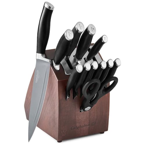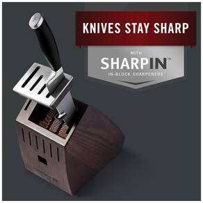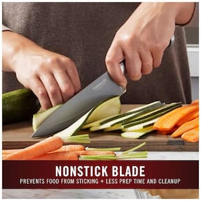 Acelere a preparação e a limpeza de alimentos com facas projetadas com lâminas antiaderentes. O design inovador incorpora dois recursos que incentivam a liberação rápida uma crista longitudinal para liberação superior de alimentos e um revestimento antiaderente. Compostas por uma única peça de aço totalmente forjado, essas facas full tang oferecem equilíbrio e força adicionais ao cortar, fatiar e picar. Bloco de facas com tecnologia de auto afiação de cerâmica SharpIN dentro dos slots afia a lâmina toda vez que você remove e substitui uma faca. Identifique rapidamente a faca que você precisa com cabos rotulados Marca: Não Informado