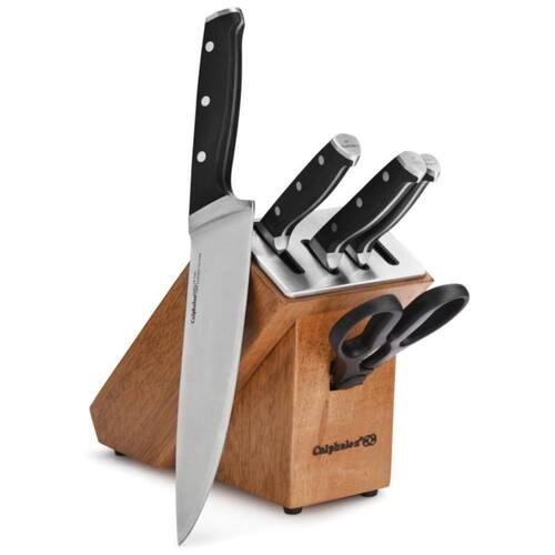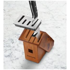 Afiadores de cerâmica embutidos afiam facas automaticamente a cada uso. Aço forjado, de alto carbono, sem manchas. As alças com rebites triplos são contornadas e rotuladas para facilitar a identificação no bloco. Full tang design para força e equilíbrio Marca: Não Informado