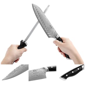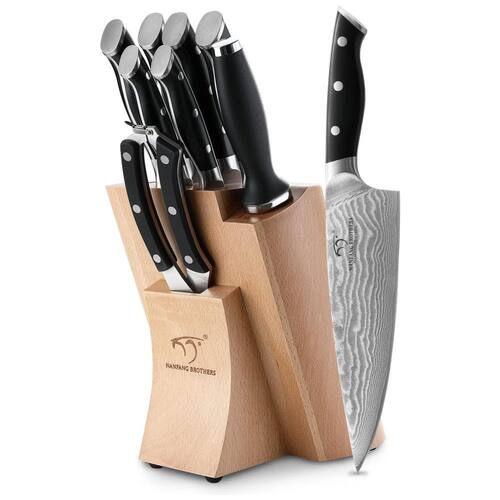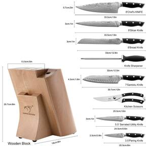 DESIGN DE QUALIDADE As facas são fabricadas com lâminas de aço damasco superior de 67 camadas com núcleo de aço VG10 para precisão e exatidão. HRC 60 2 dureza para excepcional nitidez e retenção de arestas. Identificador de design curvo oferece conforto e suporte. DURÁVEL E FÁCIL DE LIMPAR O design integrado da lâmina e da haste não é fácil de quebrar, e durável. Ele garante um desempenho duradouro e fácil de limpar. Você pode economizar muito tempo com a limpeza. FÁCIL DE CUIDAR E ZENAR A parte do bloco de madeira é feita de carvalho natural durável e o assento oco da faca é mais fácil de inserir e remover, e higiênico. Use com mais segurança Marca: Não Informado