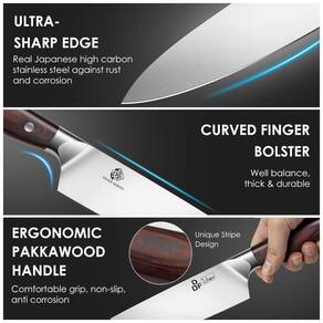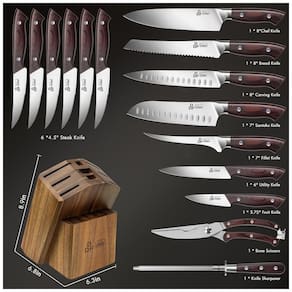 1: Todas as facas são bem organizadas em 1 bloco de madeira, mantendo sua cozinha arrumada e economizando espaço, a parte superior e inferior das ranhuras das lâminas são passadas para ventilação, ajudando as lâminas a drenar rapidamente e permanecer secas. 2: Conjunto de facas DDF iohEF para cozinha com bloco inclui faca de chef de 20,32 centímetros, faca Santoku de 17,78 centímetros, faca de pão de 20,32 centímetros, faca de corte de 20,32 centímetros, faca de filé de 17,78 centímetros, faca utilitária de 15,24 centímetros, 9,53 centímetros Faca de descascar, conjunto de 6 facas para bife de 11,43 centímetros, tesoura de cozinha, haste de afiar faca e um bloco de madeira. Este conjunto de facas pode ser para suas tarefas diárias de cozinha e atender a todas as suas necessidades. 3: A lâmina de cada faca DDF iohEF é construída em aço japonês de alto carbono para excelente proteção contra ferrugem e corrosão, e é meticulosamente polida à mão e tecnologia de têmpera precisa para nitidez duradoura e fácil afiação. 4: O equilíbrio entre a lâmina e o cabo é bastante bem equilibrado. A alça ergonômica Pakkawood reduz bastante a tensão do pulso e cria uma pegada macia e confortável e proporciona desempenho antiderrapante Marca: Não Informado