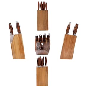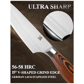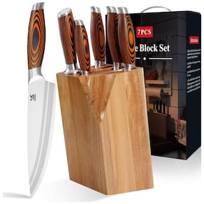 Conjunto de facas bem projetadoInclui: 1 faca de chef, 1 faca de pão, 1 faca santoku, 1 faca utilitária, 1 faca de frutas, 1 aço de afiação, 1 bloco de faca. Essas lâminas fornecerão a separação perfeita e limpa que você procura para fatiar, descascar, filetar, descascar e aparar com precisão. É essencial para qualquer chef sério. Borda afiadaA lâmina da faca é feita de aço inoxidável alemão premium com dureza rockwell de 58 2 com borda polida à mão de 12 a 15 graus de cada lado. Habilmente trabalhado com uma borda cônica de aço inoxidável que corta com facilidade e eficiência. Alça de design ergonômico Alça Pakkawood para uma pegada durável, porém equilibrada e confortável. Cada curva e ângulo da alça são ergonomicamente projetados para uma pegada confortável e ambidestra. O formato da lâmina também oferece uma resistência mínima ao corte. Mais importante ainda, o entusiasmo volta a cozinhar. Aparência elegante e simplesA lâmina é polida à mão com um acabamento acetinado revelando uma aparência deslumbrante. Os cabos pakkawood premium destacam a aparência harmoniosa de toda a peça Marca: Não Informado
