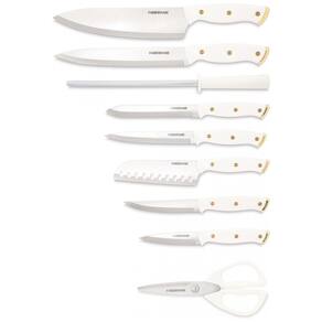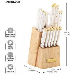 ESTILO E FUNCIONAL: Este conjunto de talheres de 15 peças adiciona um toque de elegância à decoração da sua cozinha com facas brancas acentuadas por rebites triplos dourados e tampas e zenadas em um bloco de madeira de borracha natural. LÂMINA AFIADA: Cada faca possui uma lâmina de aço inoxidável de alto carbono que garante que a faca retenha seu fio ultraafiado e facilita a preparação dos alimentos. APERTO DE CONFORTO: Ergonomicamente projetado para uma aderência confortável cada faca é perfeitamente equilibrada para precisão durante o corte. CONJUNTO DE 15 PEÇAS: inclui faca de chef de 20,32 centímetros, faca de corte de 20,32 centímetros, faca serrilhada de 13,97 centímetros, faca de borda fina de 13,97 centímetros, faca Santoku de 12,7 centímetros, faca de aparar de 8,89 centímetros, seis facas de bife de 11,43 centímetros, tesoura multiuso, aço de afiar e bloco de zenamento de madeira de borracha natural. CUIDADO FÁCIL: As facas Farberware devem ser lavadas à mão com água morna e detergente neutro. Enxágue e seque imediatamente. Facas de aço inoxidável não podem ser lavadas na máquina de lavar louça Marca: Não Informado