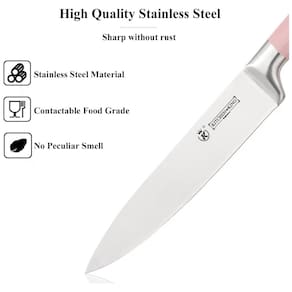 Conjunto de facas de cozinha de alta qualidadeA faca de cozinha rosa é feita de aço inoxidável de alta qualidade, que tem excelente resistência à corrosão e resistência à oxidação, garantindo que o conjunto de facas de cozinha não enferruja facilmente. Ao mesmo tempo, a aparência elegante e de alto valor facial é muito atraente.