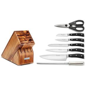 CONJUNTO DE FACAS WSTHOF Inclui uma faca de corte plano de 7,62 centímetros, uma faca de descascar de 8,89 centímetros, uma faca serrilhada de 12,7 centímetros, uma faca utilitária de 15,24 centímetros, uma faca de cozinheiro de 20,32 centímetros, um aço de afiar de 22,86 centímetros, tesoura de cozinha desmontável e um bloco de 17 slots.