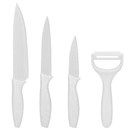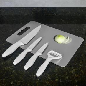 As facas possuem lâminas em aço inox, proporcionando precisão no corte. O conjunto inclui uma faca do chef 8 com medida total de 32 cm, uma faca para desossar 5 com medida total de 23,5 cm, uma faca para legumes 3,5 com medida total de 20 cm e um descascador de legumes com lâmina de cerâmica com medida total de 15 cm.