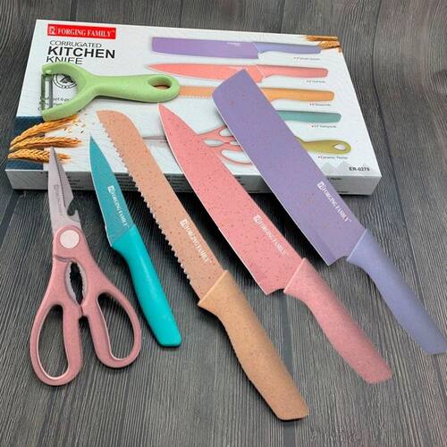 Conteúdo da Embalagem: - 1 Faca Chef 8 cm ; - 1 Faca Pão 8 cm ; - 1 Faca para descascar 3,5 cm ; - 1 Cutelo Pequeno 8 cm ; - 1 Descascador de cerâmica; - 1 Tesoura.