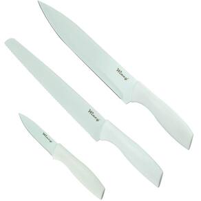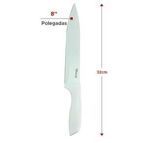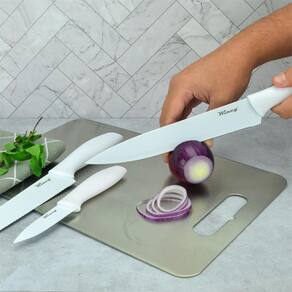 - Facas de Aço Inox - Faca do Chef 8 / Medida total 33 cm - Faca de Pão 8 / Medida Total 34cm - Faca para Legumes 3 / Medida Total 18,5 cm Ean: 7899766710253