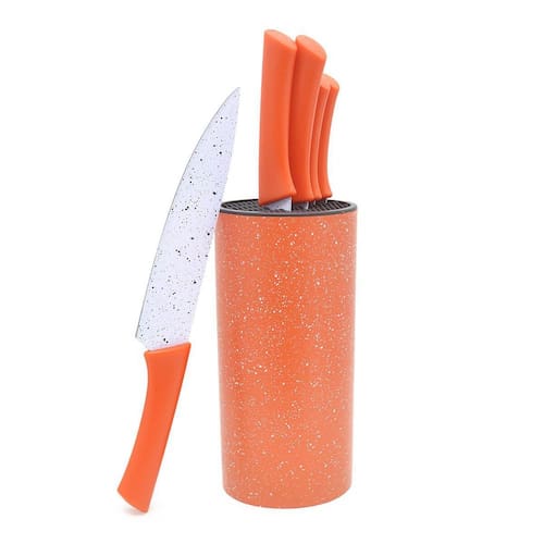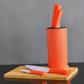 Conjunto de Facas Inox com Suporte 6 Peças COR: VERMELHO Esse jogo de facas com Suporte possui os modelos de facas mais utilizados na cozinha, as facas são confeccionadas em aço inox e possuem cabo ergonômico para um encaixe perfeito com a mão, a pintura fosca dá um visual incrível e exclusivo para o conjunto, acompanha também um suporte para exposição na bancada da sua cozinha ou área gourmet.