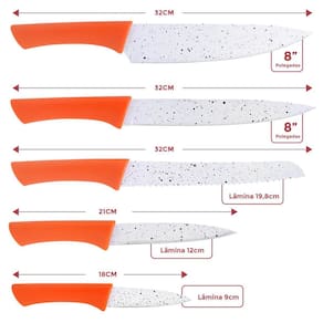- Facas de Aço Inox - Faca do Chef 8 / Medida total 32 cm - Faca 8 / Medida Total 32 cm - Faca para pães 8 / Medida Total 32 cm - Faca para desossar 5 / Medida Total 21 cm - Faca para Legumes 3,5 / Medida Total 18 cm
