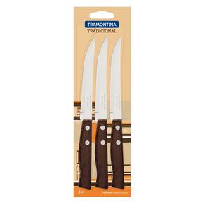 Com o Conjunto de Facas para Churrasco e Frutas Tramontina Tradicional com Lâminas em Aço Inox e Cabos de Madeira Natural 3 Peças, você terá os talheres certos para utilizar tanto no churrasco quanto para cortar e descascar frutas para o seu dia. Com facas produzidas com lâminas em aço inox que oferecem maior durabilidade e resistência, as peças garantem seu charme nos cabos de madeira naturais. Beleza e elegância é com a Tramontina! Orientações Com fio serrilhado, é ideal para o corte de carnes cozidas e frutas.As lâminas de aço inox tem maior durabilidade do fio devido ao tratamento térmico. Os cabos são de madeira natural. Rebites de alumínio. Características Gerais EAN13 7891112005143 DUN14 17891112005140 NCM 8211.91.00 Peso Líquido 0,0750 kg. Peso Bruto 0,0900 kg. Metragem 0,000245 m³. Dimensões Embalagem (Compr. X Larg. X Alt.) 12x 80x 255 mm. Observações Antes da primeira utilização, lave bem a peça e seque-a. Produto cortante e perfurante: tenha cuidado ao manusear e mantenha fora do alcance das crianças. Para maior durabilidade do produto recomenda-se secar bem antes de guardar. Recomenda-se o uso de tábuas de polipropileno ou madeira da Tramontina para maior durabilidade do fio da faca. Não é indicado o uso da faca para o corte de alimentos congelados. Para descarte dos produtos e embalagens siga as orientações de reciclagem vigentes.