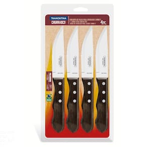 Na hora de servir e saborear um bom churrasco não pode faltar o Conjunto de Facas para Churrasco Jumbo Tramontina com Lâmina em Aço Inox com Cabo Castanho Polywood 4 Peças. Uma excelente escolha para quem deseja levar para a sua mesa qualidade e beleza. As facas são produzidas em aço inox e contam com fio altamente durável, com cabos de madeira tratada Polywood, que proporciona um design diferenciado, além de ser resistentes à impactos e altas temperaturas. Desenvolvidas para todas as ocasiões, elas tornarão os momentos de confraternização ainda melhores. Orientações As lâminas de aço inox têm maior durabilidade do fio devido ao tratamento térmico. Os cabos de madeira tratada Polywood são resistentes à impactos e alta temperaturas garantindo maior resistência e durabilidade. Rebites de alumínio. Podem ir à máquina de lavar louças facilitando seu dia a dia. Características Gerais EAN13 7891112111646 DUN14 17891112111643 NCM 8211.91.00 Peso Líquido 0,3350 kg. Peso Bruto 0,4400 kg. Metragem 0,001414 m³. Dimensões Embalagem (Compr. X Larg. X Alt.) 26x 170x 320 mm. Cor 1 4E3629 Hexa Observações Tenha cuidado ao manusear produtos cortantes e perfurantes e mantenha-os fora do alcance das crianças. Para maior durabilidade dos produtos recomenda-se secar bem antes de guardar. Para descarte dos produtos e embalagens siga as orientações de reciclagem vigentes.