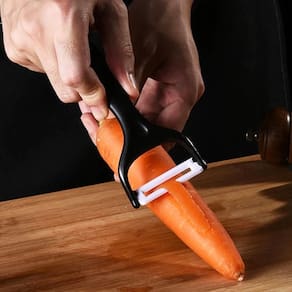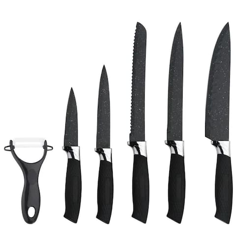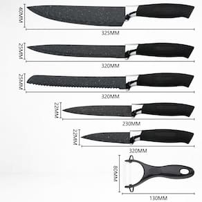 Embalagem contém 1 Faca do Chefe 18cmX3,7cm 1 Faca de Cozinha 17,5cmX2,5cm 1 Faca de Pão 17,5cmX2,5cm 1 Faca de Legumes 12cmX2cm 1 Faca de Descascar 8cmX2cm 1 Descascador 14cm Marca: Ereasthqs
