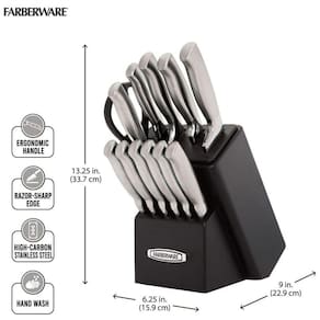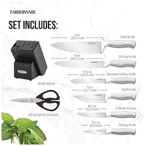 TECNOLOGIA EDGEKEEPER Cada slot principal possui uma faca embutida, afiador de cerâmica que afia automaticamente os talheres toda vez que a faca é removida ou colocada de volta no bloco, mantendo as lâminas cortando como novas LÂMINAS DE ALTA QUALIDADE Cada faca possui uma lâmina de aço inoxidável com alto teor de carbono que garante que a faca retenha seu fio ultra afiado e facilita o corte de alimentos ALÇAS ELEGANTES Cada alça é ergonomicamente projetada para uma pegada confortável e apresenta um acabamento escovado e semi fosco CONJUNTO DE BLOCOS DE 13 PEÇAS faca de cozinha de 8 polegadas, fatiador de 8 polegadas, faca serrilhada de 5,5 polegadas, faca de cozinha de 5 polegadas com kullens, faca de descascar de 3,5 polegadas, facas de carne de 6 4,5 polegadas, tesouras multifuncionais, bloco preto com apontador integrado CUIDADO FÁCIL Lavar à mão com água morna e detergente neutro enxágue e seque imediatamente garantia vitalícia limitada Marca: Não Informado
