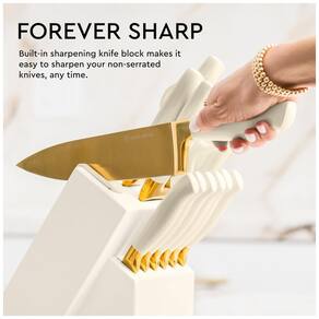 Eleve sua cozinha com este conjunto de facas douradas e brancas com bloco complemente a decoração e os acessórios dourados da cozinha com este deslumbrante conjunto de facas modernas de 14 peças com afiador O conjunto inclui: faca de chef, faca de trinchar, faca de pão, faca utilitária, faca de descascar, faca santoku, um conjunto de facas de bife brancas e douradas de 6 peças e tesouras de cozinha resistentes de aço inoxidável, tudo alojado em um conjunto de bloco de faca branco com apontador embutido POSSA AS FACAS MAIS AFIADAS DO BLOCO COM ESTE CONJUNTO DE FACAS AUTOAFIADAS nossos conjuntos de facas de cozinha com bloco autoafiado são feitos de aço inoxidável de alta qualidade que oferece grande tenacidade, resistência à corrosão e retenção de borda para excelente desempenho e afiador embutido exclusivo garante que suas facas de ouro não fiquem cegas e permaneçam afiadas para sempre recomendamos lavar e secar à mão imediatamente para manter o desempenho, aparência e brilho de seu conjunto de facas douradas e brancas para cozinha CONJUNTO DE FACA BRANCA E OURO DE QUALIDADE PREMIUM COM BLOCO TORNA O COZIMENTO MAIS FÁCIL equipe sua casa com este conjunto de faca de cabo branco coeso com um bloco de faca de madeira autoafiável para seu balcão cada faca é ergonomicamente projetada com uma alça confortável e fabricada com uma lâmina de ouro revestida de titânio para durabilidade e equilíbrio prepare carne, peixe, vegetais, frutas, pão e muito mais com facilidade com uma variedade de facas de ouro autoafiáveis para qualquer finalidade SIMPLIFIQUE SUA CASA COM UM CONJUNTO DE BLOCOS DE FACAS AFIADORES QUE GUARDAM TUDO O QUE VOCÊ PRECISA PARA FATIAR E CORTAR elimine conjuntos incompatíveis ou facas soltas e cegas que bagunçam as gavetas e aprimore sua cozinha com nosso conjunto de facas de cozinha dourado e branco que foi projetado propositadamente para complementar o ouro e o branco acessórios de cozinha e exibidos com orgulho em sua bancada conjuntos de facas brancas para cozinha com bloco fazem um presente atencioso de feriado, casamento, inauguração de casa ou formatura Marca: Não Informado