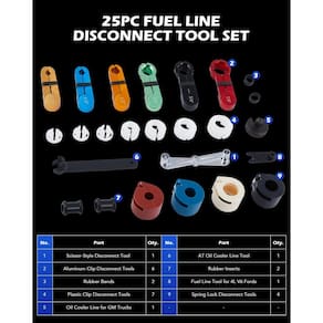 Este conjunto de 25 peças inclui sete removedores de linha de combustível de plástico (1/4", 5/16", 3/8", 1/2", 5/8", 3/4", 7/8"); seis removedores de linha de resfriamento de óleo de transmissão de alumínio (5/16", 3/8", 1/2", 5/8", 3/4" e 7/8"); quatro removedores rápidos de linha de combustível AC de plástico (3/8", 1/2", 8", 3/4"); um removedor de linha de combustível tipo tesoura de aço de duas cabeças (5/16", 3/8"); 3 ferramentas especializadas de remoção de linha de resfriadores de combustível e óleo para caminhões GM de modelos recentes, Ford Tauruses e V6 Rangers and Explorers de 4 litros, Mercury Sables e outros; 2 insertos de borracha e 2 elásticos. Nosso conjunto de ferramentas se adapta a uma ampla variedade de carros e caminhões americanos, incluindo muitos modelos Cadillac, Chevrolet, Chrysler, Dodge, Ford, GMC, Mazda, Ram e outros.