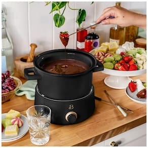 Conjunto de fondue elétrico da linha Beautiful by Drew Barrymore com panela principal em aço inox de 3L e panela adicional em cerâmica de 2L, indicado para fondues de queijo, chocolate, caldos e preparos à base de óleo. A base aquecedora elétrica de 1000W possui controle de temperatura ajustável, permitindo selecionar o nível de aquecimento adequado para manter o fondue derretido e homogêneo durante toda a refeição. ? A panela inox conta com revestimento interno antiaderente para facilitar a liberação dos alimentos e a limpeza, com peças compatíveis com lava-louças. Acompanha anel de suporte em aço inox para os garfos e cabo de alimentação para uso sobre a mesa, formando um conjunto adequado para encontros em família e recepções em ambientes internos.