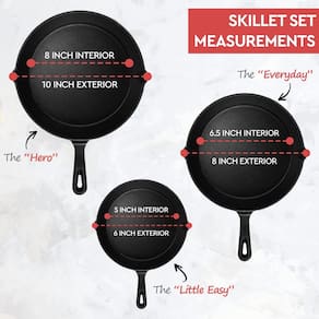 - Pronto para usar – o conjunto de frigideiras está pronto para usar, direto da caixa. Eles são pré-temperados de fábrica, o que é muito mais eficaz do que o pré-tempero em casa. O pré-tempero de fábrica torna nossas frigideiras de ferro fundido praticamente antiaderentes, fáceis de limpar, protegidas contra arranhões e também tornarão sua comida rica em sabor!