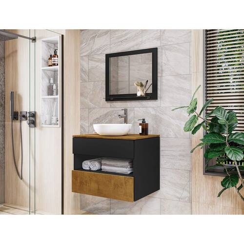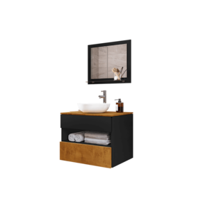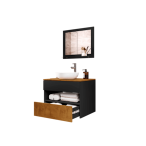 Materiais básicos: - MDP (Medium Density Particleboard ) com acabamento das bordas aparentes por fita de papel decorativo, mecanicamente aplicado por sistema hot melting, e acabamento das faces aparentes por pintura/impressão com verniz UV em padrões Premium, com textura em alto-relevo, ou em padrões lisos. - Gabinete e espelheira configurados para instalação suspensa em parede, com suportes metálicos. - Gaveta com corrediças telescópicas. - Cuba de mármore sintético ou PRFV (polímero reforçado com fibra de vidro). - Prateleira de vidro 4mm na Espelheira. - Espelho 3mm, colado no painel da Espelheira;