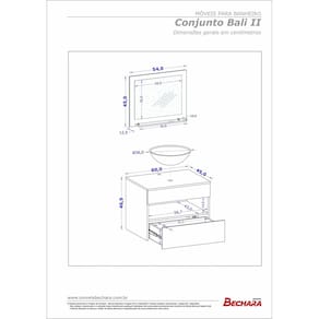 Dimensões (Altura x Largura x Profundidade) - Gabinete: 465 x 600 x 450mm; - Cuba de apoio: Ø360mm x H110mm; - Espelheira: 450 x 540 x 125mm.