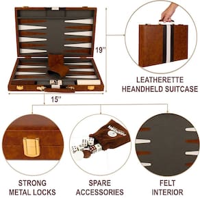 O melhor conjunto de gamão de todos os tempos! Se você está procurando o melhor tabuleiro de gamão médio, aqui está! Estamos felizes em lançar um grande conjunto de gamão de couro para sua atenção. Esperamos que sejam conjuntos de gamão úteis e especiais para adultos, e você vai adorar jogar este jogo de tabuleiro. O conjunto bacgammem é suavemente finalizado com interior de feltro e dados sobressalentes, cubos. O jogo de gammond travel back não tem pontos delicados que possam ser quebrados. Você pode aproveitar esses recursos que ajudarão este tabuleiro de gamão dobrável a servir por anos. O melhor conjunto clássico de gamão de todos os tempos! Gamão é um jogo estratégico clássico para se divertir educativamente com a família e amigos. É uma ótima maneira de comunicação entre jovens e adultos. Jogar o jogo de batgamão requer previsão, pesquisa e cautela que são habilidades importantes que todas as crianças devem possuir. Desenvolve as habilidades estratégicas, intelectuais, analíticas, lógicas, de combate e sobrevivência da criança. O melhor presente de todos os tempos! A linda caixa de embalagem torna este conjunto de gamão para adultos com instruções o presente ideal. O design fofo, a qualidade e o artesanato são essenciais para nossos jogos para 2 jogadores para adultos. Os conjuntos de gamão padrão para venda incluem: Placa de gamão estilo mala portátil de 38 x 48 cm. 2 pares de fichas (30 no total) 1 cubo duplo, 2 dados marrons, 2 dados brancos. 2 agitadores de dados. Acessórios sobressalentes: 1 fichas brancas e 1 marrom, 1 dado branco e 1 browh, 1 cubo duplo em saco de veludo Instruções de uso: Pronto para jogar? Clique em "Adicionar ao carrinho" e obtenha as vantagens do conjunto de jogos de tabuleiro de gamão. - Conjunto de gamão de couro – conjuntos clássicos de gamão com dimensões de tabuleiro 38 x 48 x 2,5 cm quando aberto e 38 x 24 x 5 cm quando dobrado. É conveniente para uso interno e externo - Jogo de tabuleiro Gamão – jogo de tabuleiro grande para adultos e crianças com interior de tabuleiro feltrado. Nosso jogo de gamão será um presente ideal para jogadores iniciantes e avançados - Jogo de dados clássico – perfeito para noite de jogos, festas, reuniões de férias, amigos e família - Acessórios de jogo: 15 fichas brancas, 15 fichas marrons, 2 dados brancos, 2 dados marrons, 2 agitadores de dados. Cada peça é produzida por artesãos com alta responsabilidade e precisão - Presentes – acessórios sobressalentes em bolsa de veludo + guia de instruções exclusivo. O livreto ajudará você a aprender como construir experiência e desenvolver habilidades estratégicas jogando gamão
