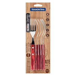 Com o Conjunto de Garfos de Mesa Tramontina com Lâminas em Aço Inox e Cabos em Madeira Polywood Vermelho 6 Peças seu jantar ou almoço ficarão muito mais deliciosos. Produzidos com lâmina em aço inox e cabos em madeira tratada Polywood, os garfos que compõem o conjunto possuem a combinação perfeita para fazerem parte da sua vida: alta durabilidade, resistência e beleza. Garanta os seus e transforme seus momentos à mesa! Orientações As lâminas de aço inox contam com maior espessura e uma estampagem do aço que garante maior resistência, evitando deformações. Os cabos de madeira tratada Polywood são resistentes à impactos e alta temperaturas garantindo maior resistência e durabilidade. Rebites de alumínio. Podem ir à máquina de lavar louças facilitando seu dia a dia. Características Gerais EAN13 7891112108103 DUN14 17891112108100 NCM 8215.99.10 Peso Líquido 0,2050 kg. Peso Bruto 0,2400 kg. Metragem 0,000722 m³. Dimensões Embalagem (Compr. X Larg. X Alt.) 25x 105x 275 mm. Cor 1 93272C Hexa Observações Antes da primeira utilização, lave bem as peças e seque-as. Tenha cuidado ao manusear produtos cortantes e perfurantes e mantenha-os fora do alcance de crianças. Para maior durabilidade dos produtos, recomenda-se secar bem antes de guardar, mesmo após lavagem em máquina.Para descarte dos produtos e embalagens siga as orientações de reciclagem vigentes.