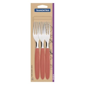 Com o Conjunto de Garfos de Mesa Tramontina Ipanema com Lâminas de Aço Inox e Cabos de Polipropileno Goiaba 3 Peças você irá garantir uma mesa cheia de estilo e muito convidativa. Perfeitas para fazerem parte do seu dia a dia, as peças que compõem o jogo são duráveis e resistentes, pois tem lâminas produzidas em aço inox e seus cabos são em polipropileno. Sua cor é diferenciada e proporciona a composição de uma mesa linda e cheia de charme. Elas são ainda muito fáceis de limpar e podem ir à máquina de lavar louças, otimizando ainda mais rotina! Orientações As lâminas de aço inox garantem maior resistência devido a espessura do aço e a estampagem das lâminas. Os cabos de polipropileno possuem maior resistência e durabilidade. Podem ir à máquina de lavar louças facilitando seu dia a dia. Observações Antes da primeira utilização, lave bem as peças e seque-as.Tenha cuidado ao manusear produtos cortantes e perfurantes e mantenha-os fora do alcance das crianças.Para maior durabilidade dos produtos recomenda-se secar bem antes de guardar, mesmo após lavagem em máquina. Para descarte dos produtos e embalagens siga as orientações de reciclagem vigentes. Características Gerais EAN13 7891112282285 DUN14 17891112282282 NCM 8215.99.10 Peso Líquido 0,0750 kg. Peso Bruto 0,0870 kg. Metragem 0,000265 m³. Dimensões Embalagem (Compr. X Larg. X Alt.) 13x 80x 255 mm. Cor 1 C26E60 Hexa