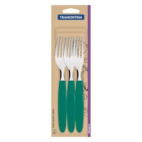 O Conjunto de Garfos de Mesa Tramontina Ipanema com Lâminas de Aço Inox e Cabos de Polipropileno Verde Esmeralda 3 Peças deixará seus momentos à mesa ainda mais especiais. Com lâminas produzidas em aço inox e cabos de polipropileno, os garfos são duráveis e resistentes e proporcionam um manuseio super confortável, além de garantir uma mesa muito mais bonita. Além disso, eles são fáceis de limpar e podem ir à máquina de lavar louças. A escolha ideal para levar mais cor ao seu dia a dia! Orientações As lâminas de aço inox garantem maior resistência devido a espessura do aço e a estampagem das lâminas. Os cabos de polipropileno possuem maior resistência e durabilidade. Podem ir à máquina de lavar louças facilitando seu dia a dia. Observações Antes da primeira utilização, lave bem as peças e seque-as.Tenha cuidado ao manusear produtos cortantes e perfurantes e mantenha-os fora do alcance das crianças.Para maior durabilidade dos produtos recomenda-se secar bem antes de guardar, mesmo após lavagem em máquina. Para descarte dos produtos e embalagens siga as orientações de reciclagem vigentes. Características Gerais EAN13 7891112282278 DUN14 17891112282275 NCM 8215.99.10 Peso Líquido 0,0750 kg. Peso Bruto 0,0870 kg. Metragem 0,000265 m³. Dimensões Embalagem (Compr. X Larg. X Alt.) 13x 80x 255 mm. Cor 1 007367 Hexa
