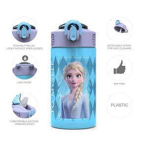 Zak Designs Disney Frozen Conjunto de 2 garrafas de água infantis com canudos reutilizáveis e laços de transporte embutidos, feito de plástico, designs à prova de vazamento, 473 ml, sem BPA, conjunto - TAMANHO: Este conjunto contém duas garrafas de água Zak PP com uma capacidade de 473 ml, cada uma medindo 17 cm de altura e 10,7 por 7 cm de largura. As garrafas de água sem BPA são recomendadas para crianças a partir de 3 anos. - MATERIAL: Estas garrafas de água de viagem são feitas de plástico resistente à quebra que é durável e livre de BPA. Podem ser lavadas na prateleira superior da máquina de lavar louça; não colocar no micro-ondas. - Fecho seguro: o bico dobrável não vaza quando está fechado, mas ainda permite fácil acesso à água quando aberto. A tampa do bico é liberada com o apertar de um botão e tem uma trava dobrável para mantê-la no lugar, evitando vazamentos e derramamentos. - CARACTERÍSTICAS: A garrafa de água à prova de vazamento com tampa rosqueada evita respingos e bagunça, e cabe na maioria dos porta-copos de carro para viagens convenientes. O canudo pode ser removido para limpeza e o bico é confortável para as crianças beberem. - Estilo de vida: Manter-se hidratado é uma parte importante de ser saudável! Com gráficos icônicos com Anna e Elsa, as inovadoras garrafas de água da Disney da Zak Designs ajudam a tornar mais fácil para adultos e diversão para crianças!