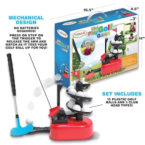 - Até mesmo o Tee-Up é muito divertido: você vai adorar a maneira bacana como esse conjunto de minigolfe configura a bola para a tacada inicial. Seu filho simplesmente pressiona a alavanca e o braço mecânico alimenta as bolas diretamente na camiseta.