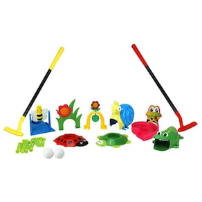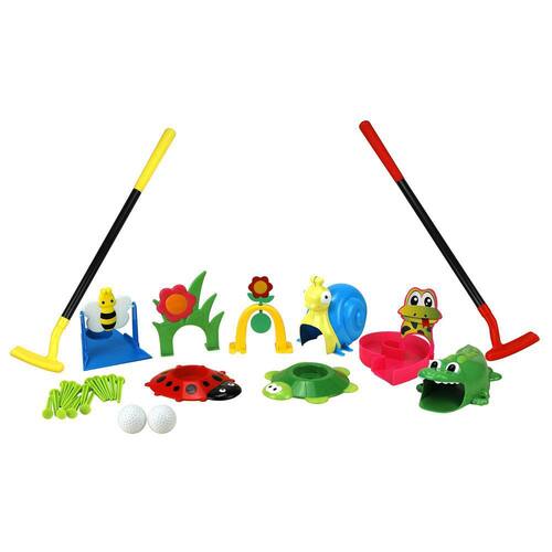 - Vem com 6 obstáculos fofos (abelha, flores, caracol, cobra, crocodilo), 2 tacos, 2 buracos de treino em forma de animal (tartaruga e besouro), 2 bolas de golfe