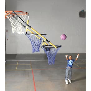 O conjunto de metas de basquete Two-Hoop Tierdrop triplica instantaneamente a oportunidade de sucesso do aluno quando suspenso de sua meta existente. Essa meta de tamanho regulamentar é colocada em cascata com dois aros de 18 polegadas de diâmetro, colocando cada meta 1 pé abaixo e 18 polegadas mais perto do que o aro acima dela. Vendido como 1 Two-Hoop Tierdrop (oferecendo 2 aros). Pode ser necessária uma escada para conectar à cesta de basquete existente. Folheto do produto