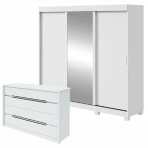 O conjunto inclui um guarda-roupa Saion Plus com 3 portas e 3 gavetas, acompanhado por uma cômoda Urban de 8 gavetas. Esses móveis oferecem uma solução completa para armazenar roupas e itens pessoais, combinando funcionalidade e estilo contemporâneo.