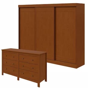 O conjunto inclui um guarda-roupa Nice de 3 portas e 4 gavetas, juntamente com uma cômoda Maggiore New de 6 gavetas, fabricados em MDP/MDF. Esses móveis oferecem uma solução completa para armazenar roupas e itens pessoais, combinando funcionalidade com um design contemporâneo e durável.