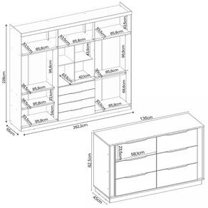 Dimensões do Guarda roupa: 262,2 cm(L) x 228 cm(A) x 55 cm(P);
