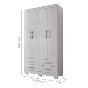 O guarda roupa é feito em MDP 15mm.Possui 4 gavetas com corrediças telescópicas, 4 Portas, 2 prateleiras e 1 cabideiro.