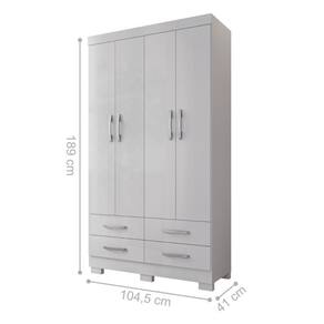 O guarda roupa é feito em MDP 4 gavetas com corrediças telescópicas, 4 Portas, 2 prateleiras e 1 cabideiro.