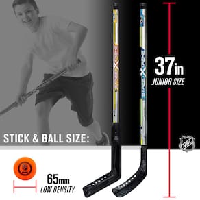 Franklin Sports Conjunto de Hóquei de Rua - NHL - Bastões e Bola de Goleiro e Jogador - Conjunto de hóquei de rua: este conjunto de hóquei de rua juvenil vem com (1) taco de goleiro jovem, (1) taco de hóquei júnior e (1) bola de hóquei de rua tamanho oficial para que você tenha tudo o que precisa para começar o jogo - Varas duráveis: os bastões são construídos com material ABS flexível para durabilidade premium que resiste jogo após jogo - Bola oficial de hóquei de rua: este conjunto vem com uma bola de hóquei de rua de tamanho oficial especialmente projetada para saltos baixos para manter a bola em jogo - Taco de jogador: O bastão de 86 cm tem o tamanho perfeito para jovens jogadores que desejam aprimorar suas habilidades de hóquei de rua. - Taco de goleiro: entre os canos com o bastão de goleiro júnior de 86 cm e tente fechar seus amigos.