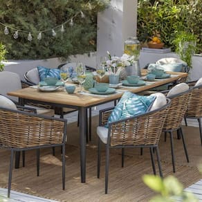 "Transforme suas refeicoes em momentos inesqueciveis com o Conjunto de Jantar Teca Cordova. Este conjunto de 9 pecas, projetado para acomodar confortavelmente ate 8 pessoas, e a adicao perfeita para sua sala de jantar. Com uma estrutura robusta feita de aluminio resistente e uma superficie de textileno, este conjunto e nao apenas esteticamente agradavel, mas tambem construido para durar.