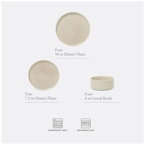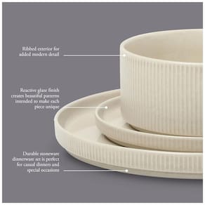 Imagine uma cidade costeira pitoresca, com seu estilo de vida tranquilo e um sol radiante, como fonte de inspiração para design e inovação. A Coleção de Jantar Solana Coast Reactive captura o charme intocado de uma cidade à beira-mar e o traduz em elegante louça, perfeita tanto para refeições internas quanto externas. O acabamento de alto brilho reflete o sol nas águas calmas, adicionando um brilho radiante a cada peça. Feita de argilas terrosas, esta coleção se transforma em deslumbrante cerâmica que complementa qualquer mesa, realçando a vivacidade de cada prato. Sua fabricação requer um processo complexo, no qual as peças são queimadas várias vezes em altas temperaturas para criar uma construção perfeitamente resistente ao desgaste e não porosa. Uma camada de esmalte reativo finaliza o processo, permitindo que cada prato e tigela ganhem vida com sutis variações naturais, garantindo que nenhuma peça seja igual à outra. Projetada com laterais altas e retas para empilhamento fácil e nervuras exteriores para adicionar profundidade e textura, esta coleção alcança o equilíbrio perfeito entre elegância clássica e estilo contemporâneo. Este conjunto de jantar, como um conjunto de peças essenciais para o lar, é um presente de bom gosto para qualquer ocasião. Amado por sua utilidade prática e apelo decorativo, ele expressa seu gosto impecável e bons desejos para familiares, amigos, novos proprietários e recém-casados. Lavável em lava-louças e micro-ondas. Genuine sophisticated and thoughtfully versatile, Gibson Elite oferece uma mistura elegante de forma e função para uma infinidade de louças, utensílios de servir e acessórios de mesa. Qualidade na seleção de materiais e estética elegante em designs e técnicas de esmaltação proporcionam infinitas possibilidades para arranjos de mesa criativos e ocasiões de jantar.