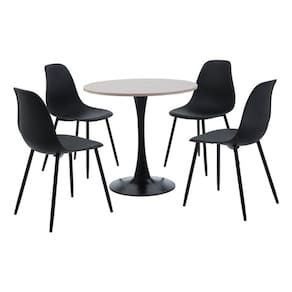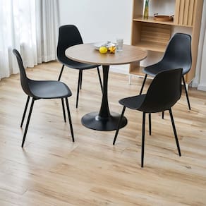A mesa, com 80 cm de diametro e 75 cm de altura, possui um tampo resistente e sofisticado nas cores preta e madeira, garantindo durabilidade e facil manutencao. As cadeiras, com estrutura em aco e assento em madeira, oferecem conforto e estabilidade, medindo 46 cm x 51 cm x 83,5 cm.