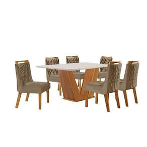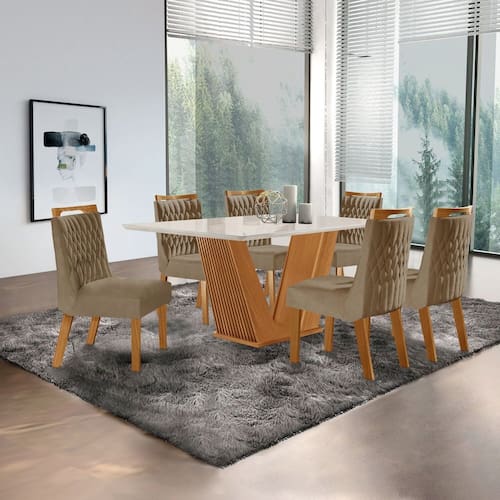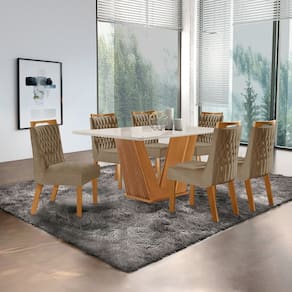 Beleza e sofisticação para sua sala de jantar! A mesa conta com tampo em vidro off-white e base em madeira ripada no elegante tom castanho cinamomo. As 6 cadeiras Atena oferecem conforto com estofado em tecido suede capuccino e detalhes em madeira no encosto, que combinam perfeitamente com os pés. Um conjunto moderno e acolhedor, ideal para reunir a família com estilo. Medida da Mesa (A x L x P): 80cmx160cmx80cm Peso da Mesa: 48,1 kg Mesa suporta até: 50 kg Acabamento da Cadeira/Banco: Pintura UV Acabamento da Mesa: Pintura UV Almofada do assento: Fixa Ambiente Principal: Sala de Jantar Cadeira/Banco estofada: Encosto e Assento Estofados Cadeira/Banco Estofada: Encosto e Assento Estofados Cadeira/Banco suporta até: 120 kg codigo_ean: 7900288210944 Complexidade da Montagem: Média: pode ser montado por mais de uma pessoa e/ou necessite de maior conhecimento para montagem Cor: Castanho Cinamomo/Pena Caramelo/Off White Cor do Produto: Castanho Cinamomo/Pena Caramelo/Off White Cor Secundária: Marrom De Canto (Canto Alemão): Não Design da Base: Em V Enchimento do Assento: Espuma D-20 Escala de Brilho: Semi-Fosco Espessura do Tampo: 40 mm Estrutura do Assento: MDF/MDP/Espuma Formato do Tampo: Retangular Itens Inclusos: 1 Mesa, 6 Cadeiras, Kit Ferragens e Manual de Montagem Linha ou Coleção: Atena Manual de Especificação Técnica: https://product-hub-prd.madeiramadeira.com.br/800176629/documents/475aceda-0ea2-4cef-a009-05471986fc863122847286817545913906364.pdf Manual de Montagem e Instalação: https://product-hub-prd.madeiramadeira.com.br/800176629/documents/e4214d3c-5e8e-46b5-a1c3-c6857ba685e93127387286817549099310821.pdf Marca: LJ Móveis Material da Base da Mesa: MDF/MDP Material da Estrutura da Cadeira: MDF/MDP Material do Tampo: Vidro/MDF Material Principal: MDP/MDF Material Principal das Cadeiras/Bancos: MDF/MDP Medida da Cadeira/Banco (A x L x P): 96cm x 47cm x 59cm Medida do Tampo (L x C x E): 80cmx1,60cmx2,5cm Mesa Dobrável: Não Mesa Extensível: Não Necessita Montagem: Sim Origem do Produto: Nacional Peso da Cadeira/Banco: 9,55 kg Possui Apoio para Braços: Não Possui Apoio Para os Pés: Não Possui Vidro: Sim Quantidade de Cadeiras: 6 Quantidade de Lugares: 06 Recomendações de Uso, Manutenção e Limpeza: Pano úmido. Não utilizar produtos de limpeza Revestimento da Cadeira/Banco: Suede Sistema de Montagem: Cavilhas, Parafusos e Cantoneiras. Tipo de Assento: Fixo Tipo de Encosto: Fixo